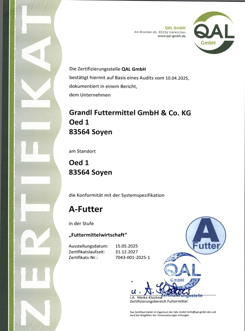 Die Gesundheit und Leistungsfähigkeit Ihrer Kühe ist unsere oberste Verpflichtung. Durch interne und externe Audits sowie eine sorgfältige Überprüfung aller eingehenden und ausgehenden Lieferungen stellen wir sicher, dass Sie stets die beste Ware erhalten. Der Betrieb hält folgende Zertifikate.